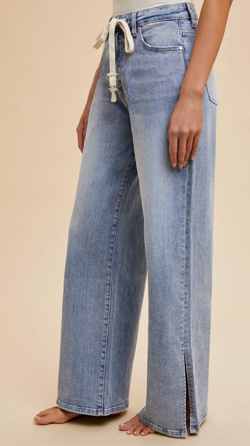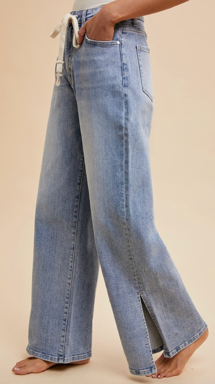 • Waist Tie Detail Stretch Side Slit Wide Leg Jean