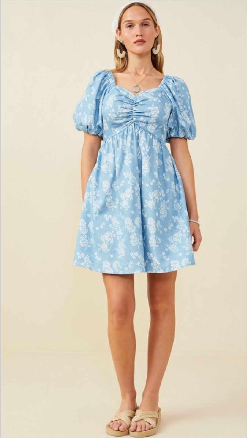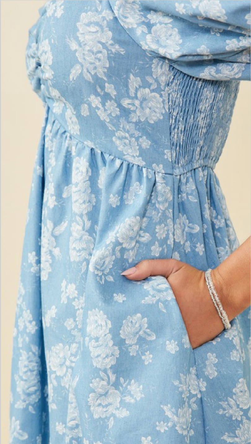 • Romantic Floral Puff Sleeve Chambray Dress